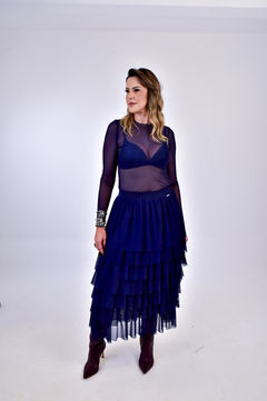 Saia confeccionada em tule de poliamida com leve elasticidade . Possui uma modelagem solta e ampla. Cós reto , saia com babados em camadas . Comprimento mídi.